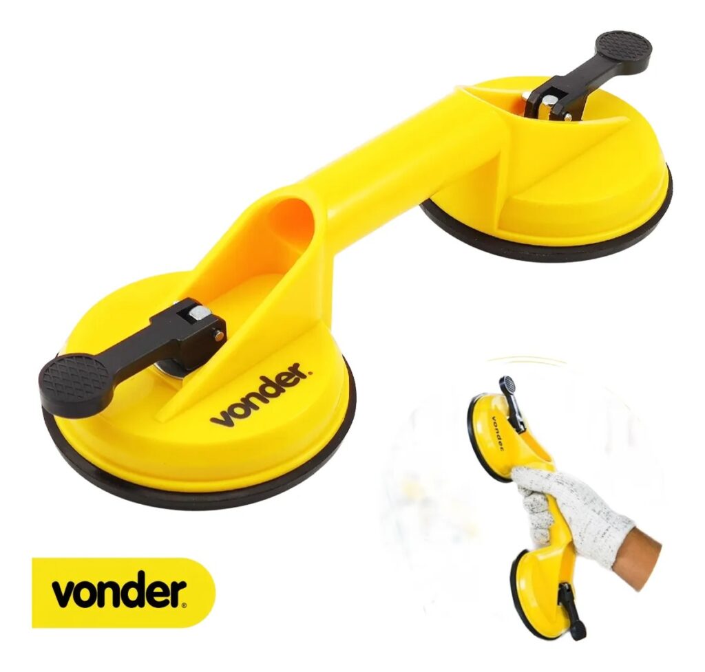 A ventosa dupla facilita o transporte e manuseio de peças planas e lisas, como vidros, espelhos, cerâmicas e chapas metálicas leves.